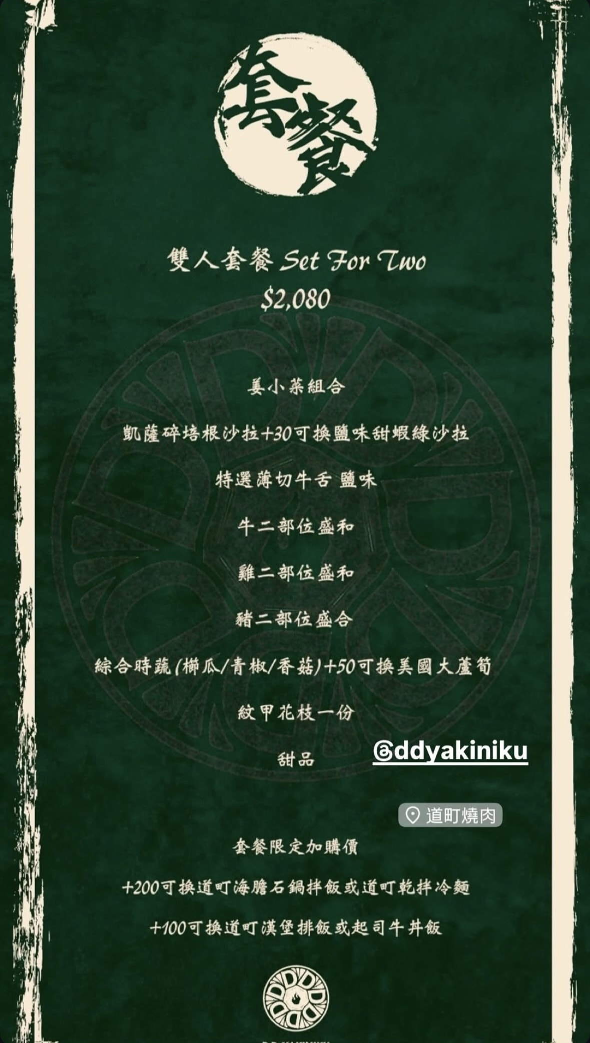 最划算的就是 雙人套餐 $2080,一次就能吃到牛、雞、豬、海鮮與蔬菜,還能加購特色料理,CP值爆表!
